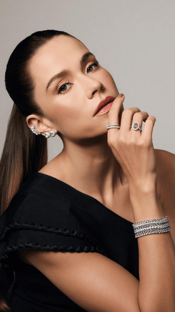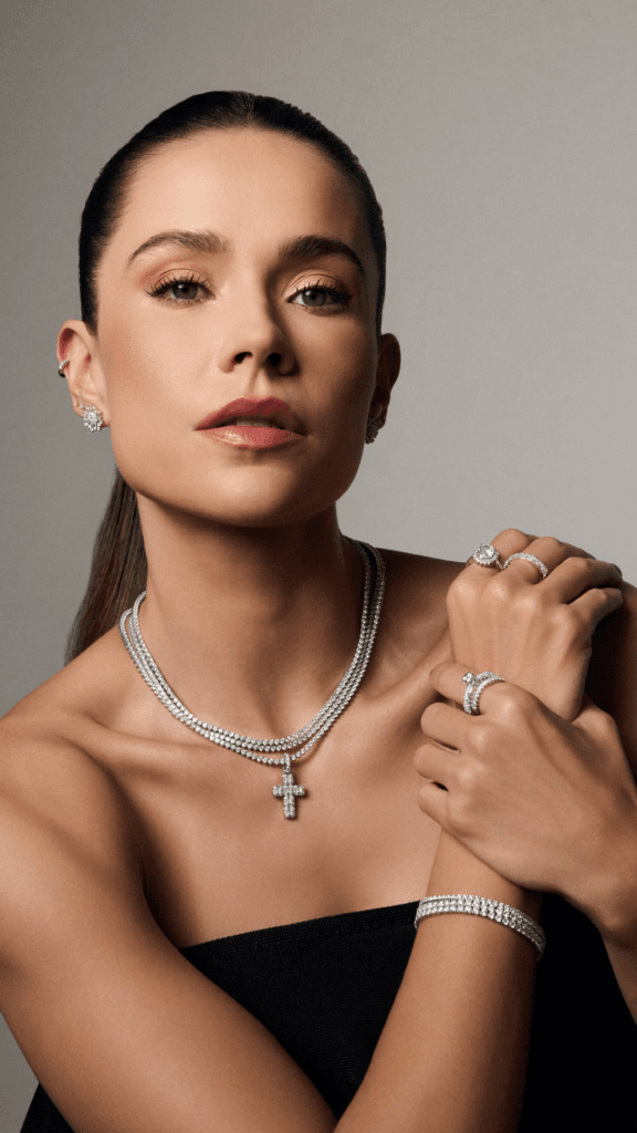 Ao combinar cravejados atemporais, a sofisticação da zircônia champagne, a autenticidade das pedras naturais e a força das cores, ampliando as possibilidades de uso e expressão.